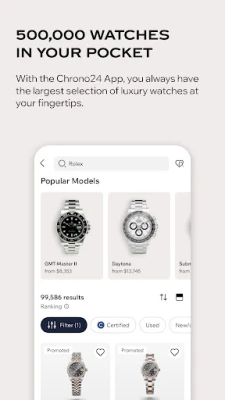 Με την εφαρμογή Chrono24, ανακαλύψτε την κορυφαία αγορά για ρολόγια πολυτελείας παντού και πάντα. Βρείτε το ρολόι των ονείρων σας ανάμεσα σε 500.000+ μοντέλα από Rolex, Omega και άλλες επωνυμίες, με προσφορές από 20.000+ εμπόρους και ιδιώτες.