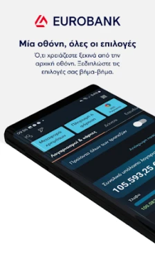 Το Eurobank Mobile App επαναπροσδιορίζει την τραπεζική σας εμπειρία, προσφέροντας έναν ολοκληρωμένο προσωπικό χρηματοοικονομικό βοηθό στα χέρια σας. Από την κεντρική οθόνη, έχετε μια διαυγή εικόνα των οικονομικών σας: δείτε το συνολικό υπόλοιπο των λογαριασμών σας, παρακολουθήστε τα έσοδα και έξοδα του μήνα, και εμβαθύνετε σε αναλυτικές πληροφορίες για κάθε λογαριασμό και κάρτα ξεχωριστά. Ανακαλύψτε επίσης τα προνόμια των ευρώ €πιστροφή που συγκεντρώνετε από τις αγορές σας με κάρτες Eurobank. Με ένα απλό σύρσιμο της οθόνης, αποκτήστε άμεση πρόσβαση στα δάνεια, τις επενδύσεις και τα ασφαλιστικά σας προϊόντα, διατηρώντας τον πλήρη έλεγχο των οικονομικών σας σε ένα μόνο σημείο.
