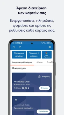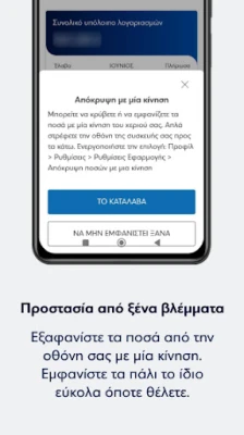 Εξασφαλίστε την ιδιωτικότητα των δεδομένων σας με την πρωτοποριακή λειτουργία απόκρυψης ποσών, προστατεύοντας τις πληροφορίες σας από αδιάκριτα βλέμματα με μια απλή κίνηση. Πραγματοποιήστε τις καθημερινές σας συναλλαγές με απαράμιλλη ταχύτητα: μεταφέρετε χρήματα, πληρώστε οργανισμούς, στείλτε χρήματα μέσω IRIS Payments, διαχειριστείτε τις «αγαπημένες» σας ενέργειες και τις πάγιες εντολές σας, όλα με λίγα μόλις αγγίγματα. Επιπλέον, η διαχείριση των καρτών σας γίνεται εύκολη και άμεση. Από την αρχική οθόνη, μπορείτε να ενεργοποιήσετε, να πληρώσετε, να φορτίσετε ή ακόμα και να απενεργοποιήσετε προσωρινά τις κάρτες σας, έχοντας τον πλήρη έλεγχο στα χέρια σας.