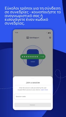 Το QuickSupport μετατρέπει την ανάγκη για τεχνική βοήθεια σε μια απλή διαδικασία. Ο συνεργάτης σας μπορεί να συνδεθεί από οποιαδήποτε συσκευή – σταθερό υπολογιστή, πρόγραμμα περιήγησης ιστού ή κινητό – για να παρέχει υποστήριξη Η/Υ, να προσαρμόσει ρυθμίσεις Wi-Fi, να βλέπει πληροφορίες συσκευής, και να διαχειρίζεται εφαρμογές. Η δημιουργία μιας σύνδεσης είναι εξαιρετικά απλή: απλά ανοίξτε την εφαρμογή, μοιραστείτε το μοναδικό σας αναγνωριστικό ή εισάγετε έναν κωδικό συνεδρίας και αποδεχτείτε το αίτημα σύνδεσης. Χωρίς τη ρητή συγκατάθεσή σας, καμία σύνδεση δεν είναι δυνατή, τονίζοντας τον απόλυτο έλεγχό σας. Επιπλέον, η εφαρμογή προσφέρει τη δυνατότητα επαλήθευσης της ταυτότητας του συνεργάτη, εμφανίζοντας στοιχεία όπως όνομα και email, ενισχύοντας την ασφάλεια και την εμπιστοσύνη.