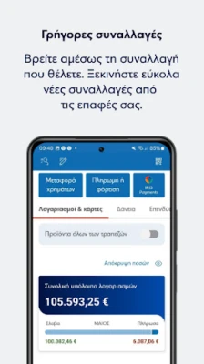 Το Eurobank Mobile App επαναπροσδιορίζει την τραπεζική σας εμπειρία, προσφέροντας έναν ολοκληρωμένο προσωπικό χρηματοοικονομικό βοηθό στα χέρια σας. Από την κεντρική οθόνη, έχετε μια διαυγή εικόνα των οικονομικών σας: δείτε το συνολικό υπόλοιπο των λογαριασμών σας, παρακολουθήστε τα έσοδα και έξοδα του μήνα, και εμβαθύνετε σε αναλυτικές πληροφορίες για κάθε λογαριασμό και κάρτα ξεχωριστά. Ανακαλύψτε επίσης τα προνόμια των ευρώ €πιστροφή που συγκεντρώνετε από τις αγορές σας με κάρτες Eurobank. Με ένα απλό σύρσιμο της οθόνης, αποκτήστε άμεση πρόσβαση στα δάνεια, τις επενδύσεις και τα ασφαλιστικά σας προϊόντα, διατηρώντας τον πλήρη έλεγχο των οικονομικών σας σε ένα μόνο σημείο.